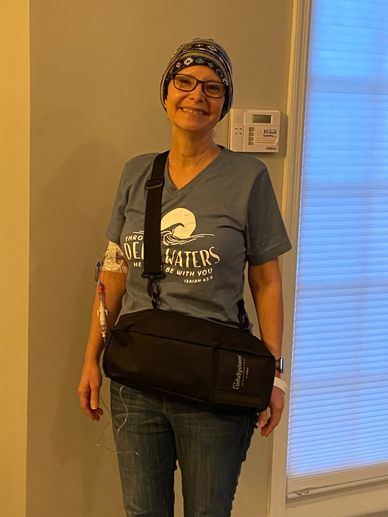 I had to wear this bag for five days including the night. Inside was a bag of chemo called HiDAC or high-dose cytarabine. It was changed every morning at the infusion center. Not a huge issue until it was time to go to bed. I was afraid I would twist and somehow pull on my line. Rick was nervous it would break in the bed. But we made it just fine.