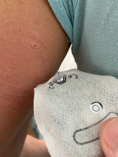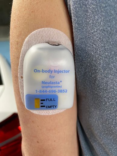 This little injector helps to boost immunity and to keep me from having to go back into the hospital with a neutropenic fever. The nurse put it on me, then set it to go off. I kept waiting and waiting and then SNAP! The tiny little needle was injected into my skin. (The waiting was far worse than the snap.) It would then give me the medication over a specific time.