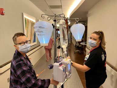 LLS was having the Light the Night event in Orlando. Our floor participated in its own way. First they handed out the white patient/survivor lanterns to hang on our IV poles. Then the nurses were either walking with us, (the nurse with me was the most bubbly and connected to my heart) or stationed all round the floor encouraging us and handing out beads and playing music. We had so much fun walking around. They even let one of my sons come up to walk.