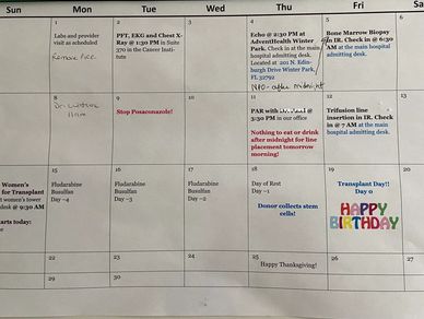 Wow! I have a donor and a stem cell transplant date. This calendar is filled with tasks I had to do to get ready for my big day.